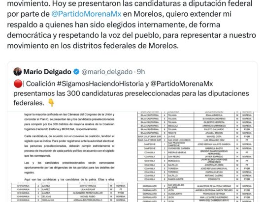 Este jueves, el partido Morena, a través de su Dirigente Nacional, Mario Delgado, hizo público el listado con las 300 candidaturas a diputaciones federales por Morena, de cara a los comicios del 2024. Este acontecimiento marcó un hito importante en el proceso electoral, generando reacciones y muestras de apoyo por parte de figuras prominentes dentro del partido. Entre estas figuras, se destaca la voz de Margarita González Saravia, aspirante de…