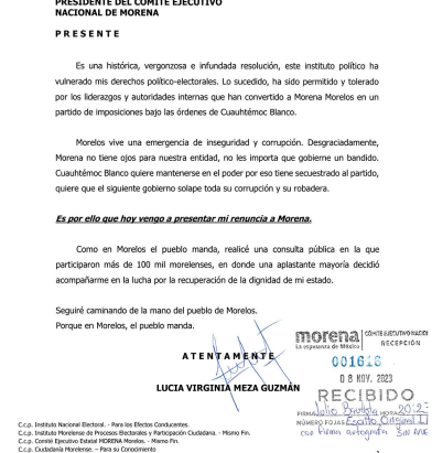 La senadora por Morelos, Lucy Meza Guzmán oficializó, la noche de este miércoles, su renuncia al partido MORENA, lo que sería un paso más, para oficializar en breve su postulación como abanderada del Frente Amplio Por Morelos a la gubernatura.La carta de renuncia, fechada en la Ciudad de México este 08 de noviembre, está dirigida al presidente nacional de MORENA, Mario Delgado Carrillo y a la letra dice: “En una…