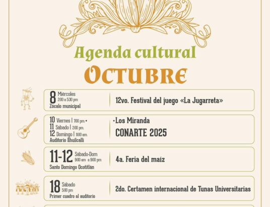 ¡Octubre, Mes de la cultura en Tepoztlán! El H. Ayuntamiento de Tepoztlán da la bienvenida a Octubre como el mes dedicado a la celebración de nuestra rica herencia cultural. Con el objetivo de honrar el patrimonio del Pueblo Mágico y ofrecer una agenda diversa y de calidad, la Dirección de Cultura y Turismo ha preparado una serie de eventos para la comunidad y nuestros visitantes.Invitamos a todo el público a…