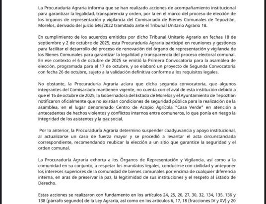 La Procuraduría Agraria advirtió qué “no respalda” la segunda Convocatoria del 26 de octubre, ya que contraviene el Oficio: 3986/2025 TUA DTO. 18, donde se determina y decreta su suspensión. En un comunicado, la dependencia federal aclara que dicha segunda convocatoria, que algunos integrantes del Comisariado mantienen vigente, “no cuenta con el aval de esta institución debido a que el 16 de octubre de 2025, la Gobernadora del Estado de…