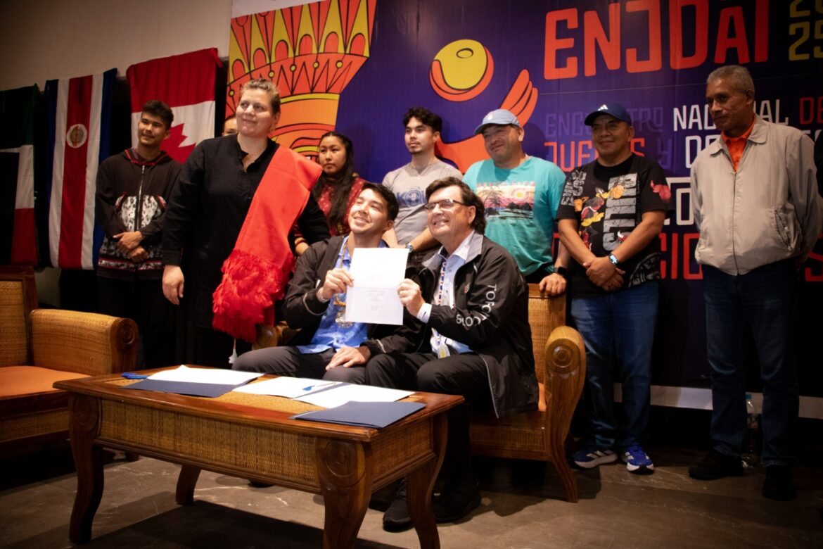 Ana Claudia Collado García, presidenta de la FMJDAT; Clay Melnike, representante de Indigenous Sport & Wellness Ontario (ISWO) de Canadá y Kyle Worl, representante del Central Council of the Tlingit & Haida Indian Tribes of Alaska (CCTHITA) de Estados Unidos, fueron los encargados de firmar un Memorándum de Entendimiento (MoU) que consolida una nueva etapa de cooperación internacional entre los pueblos originarios de la zona.