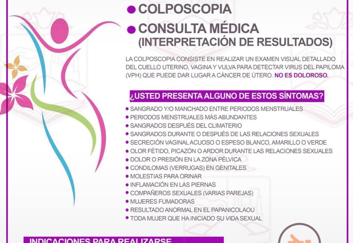 En este espacio, supervisado por la Dirección de Salud Pública del Gobierno con Rostro Humano de Jiutepec, se realizarán estudios de papanicolaou y colposcopia, asimismo se llevará a cabo la interpretación de ambos a partir de una consulta médica hecha por una médica profesional; los horarios de atención son los días martes y miércoles de las 10:00 a las 16:00 horas.