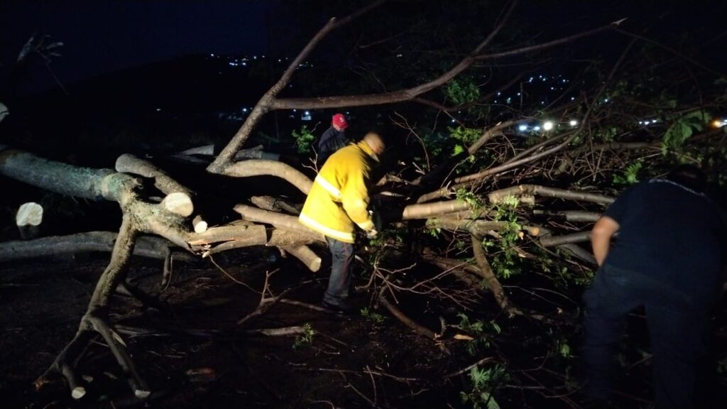 Elementos de la Dirección de Protección Civil y Bomberos de Yautepec, atendieron el llamado ciudadano y retiraron una jacaranda que cayó por los fuertes vientos registrados la tarde de este sábado.