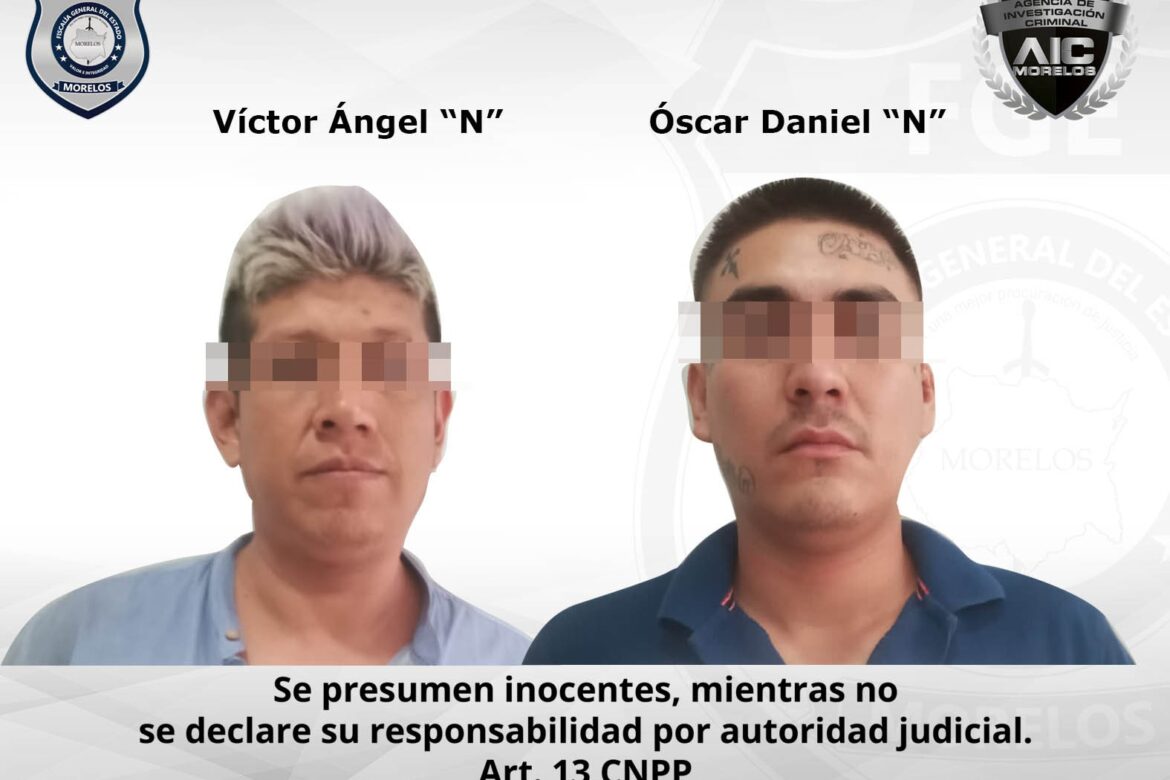 Elementos de la Agencia de Investigación Criminal (AIC) realizaron la detención de Víctor Ángel “N” alias “El Chabelo” y Óscar Daniel “N” alias “Raza”, en la colonia Francisco I. Madero del municipio de Cuautla, quienes fueron presentados ante la autoridad requirente.