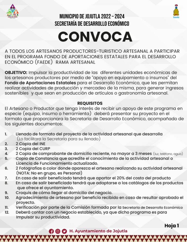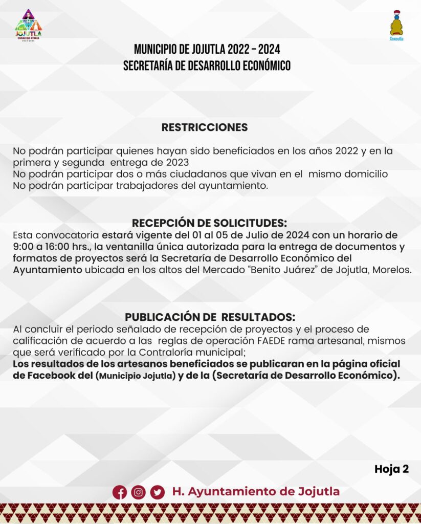 Al concluir el periodo señalado de recepción de proyectos y el proceso de calificación de acuerdo con las reglas de operación FAEDE rama artesanal, los resultados de los artesanos beneficiados se publicaran en la página oficial de Facebook del Municipio Jojutla y de la Secretaría de Desarrollo Económico.