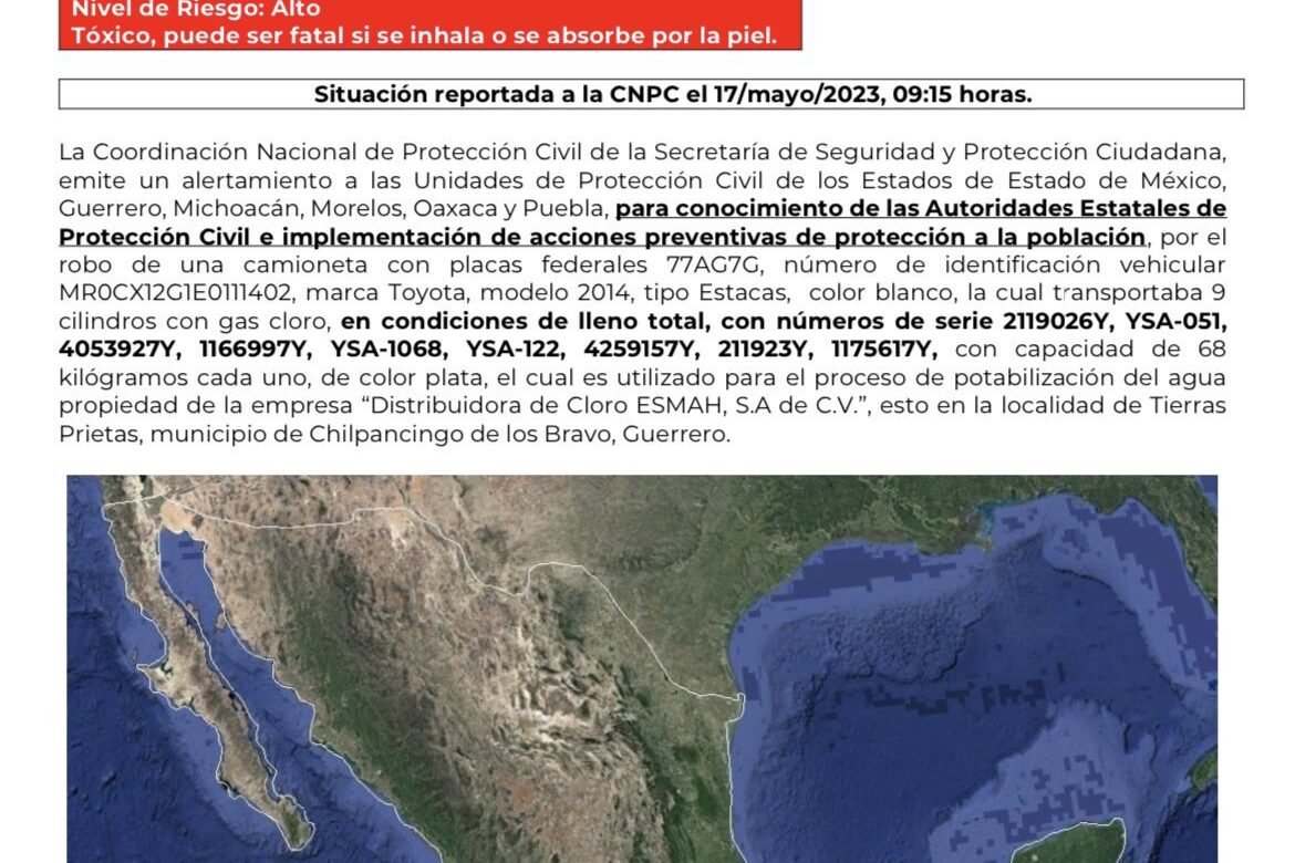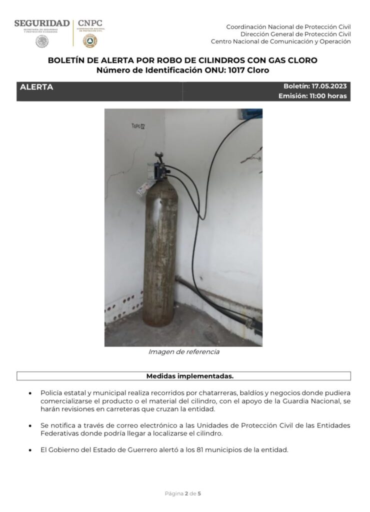 alertamiento por robo de cilindros con gas cloro, pedimos a la población extremar precauciones debido a que el mal manejo de este producto es extremadamente tóxico si se inhala o se absorbe por la piel.
