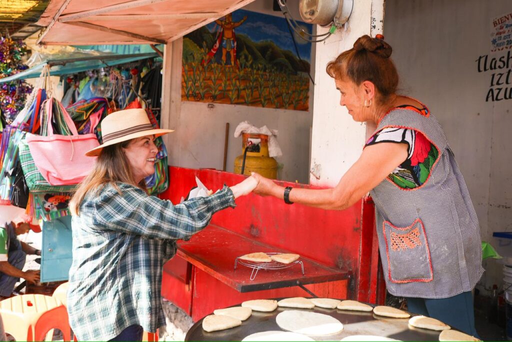 Durante la gira de trabajo, Margarita González Saravia dialogó con comerciantes, saludó a vecinas y vecinos de la comunidad, y convivió con visitantes que recorrían este punto emblemático de Tepoztlán.