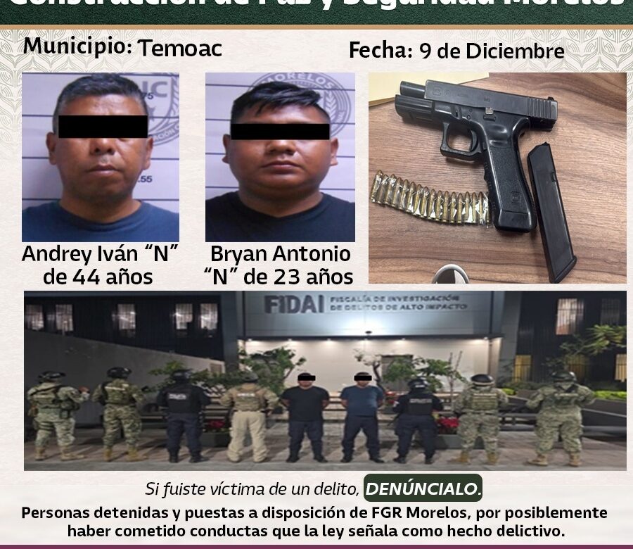 En el municipio de Temoac ejecutaron seis órdenes de cateo en diversos inmuebles en el municipio de Temoac, con el fin de efectuar trabajos de investigación, lo que dio como resultado la detención de Andrey Iván “N” de 44 años y Bryan Antonio “N” de 23 años, quienes son elementos activos como policías municipales.