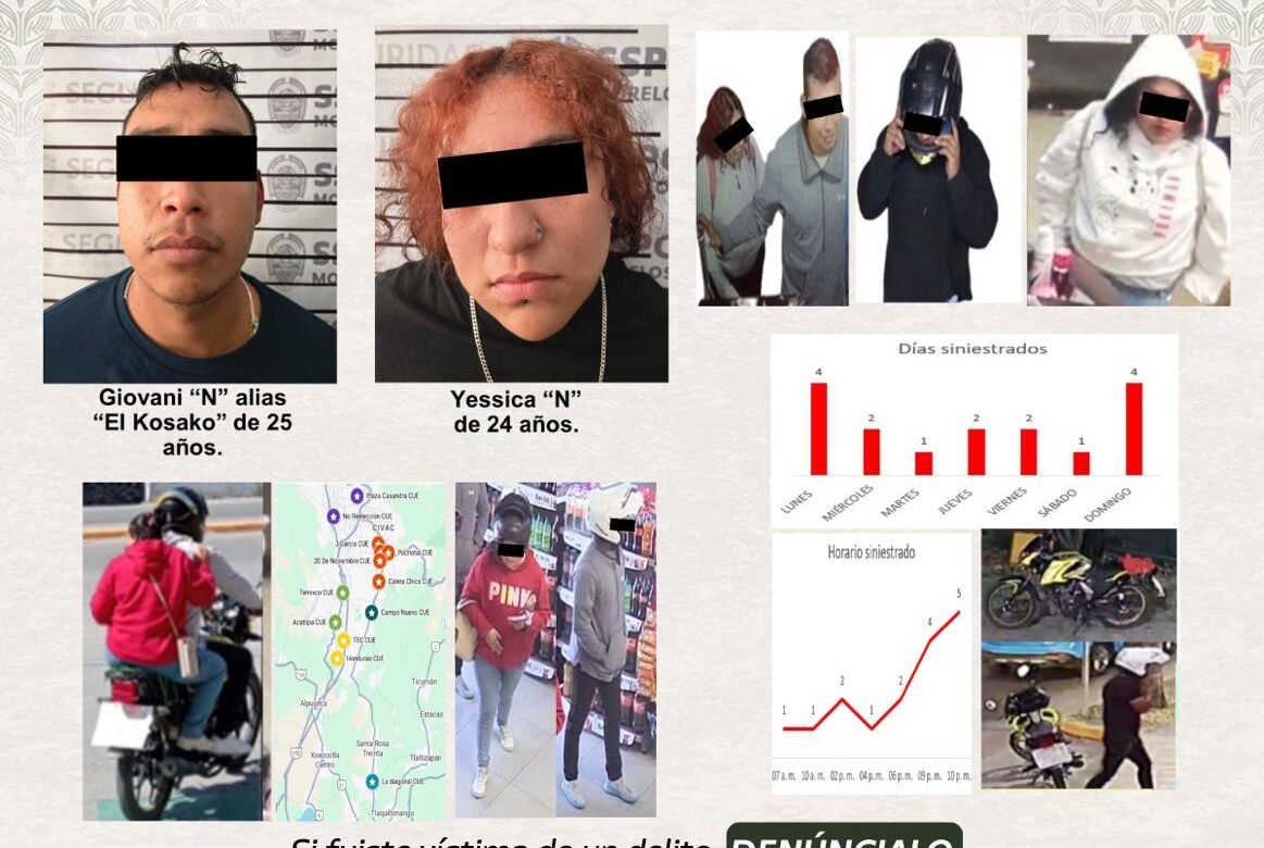 En otro tema, Urrutia Lozano destacó la detención de Giovani “N” de 25 años, alias “El Kosako” y Yessica “N” de 24 años, identificados por actos de investigación y cámaras de videovigilancia en delitos de robo en diversas tiendas de conveniencia OXXO y tiendas de autoservicio en los municipios de Emiliano Zapata, Cuernavaca, Jiutepec y Temixco.
