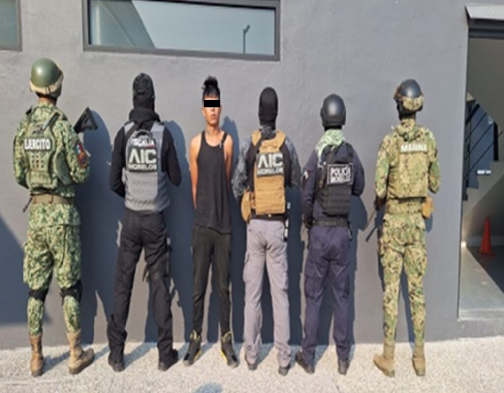 Derivado de una denuncia ciudadana, se ejecutó una orden de cateo en un domicilio del municipio de Temixco, lo que dio como resultado la detención de Luis Alberto “N” de 18 años, y se aseguró un arma de fuego corta, siete teléfonos celulares, 10 bolsas con sustancia similar al “cristal”, una bolsa con vegetal verde similar a la “marihuana”, una camisola militar con la leyenda “DEFENSA”.