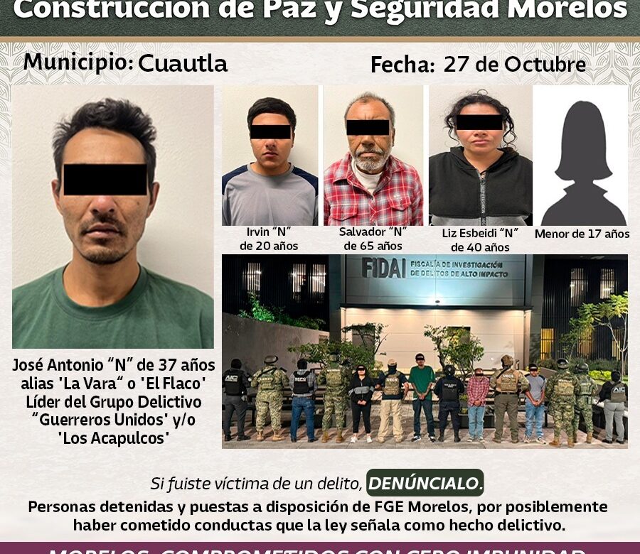 Es preciso mencionar que, entre las personas detenidas, se localizó a un menor de edad, el cual fue debidamente resguardado y presentado ante el Agente del Ministerio Público de la Fiscalía de Investigación de Delitos de Alto Impacto (FIDAI) de la Fiscalía General del Estado de Morelos (FGE), y donde se resolverá su situación jurídica de todos los detenidos y objetos asegurados.