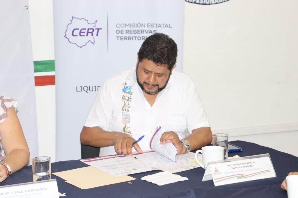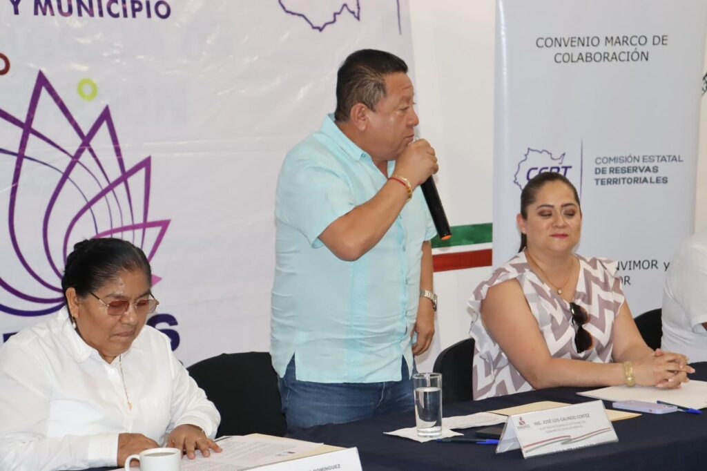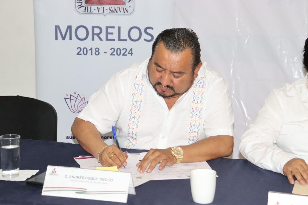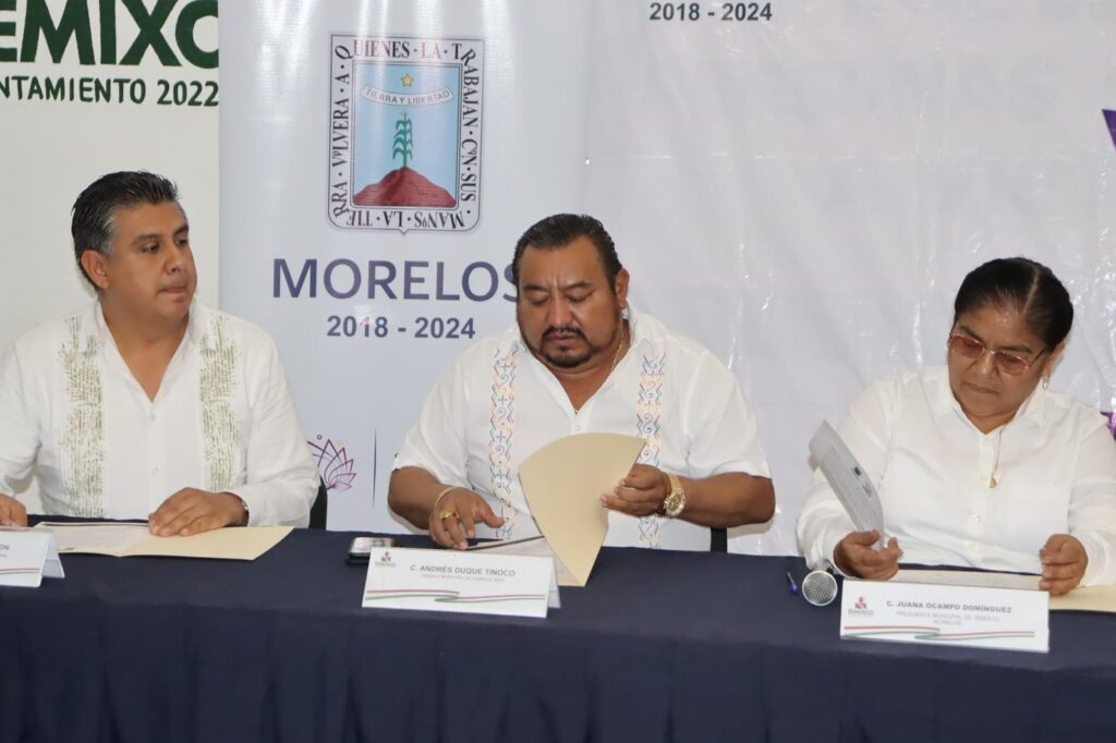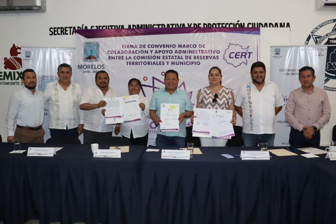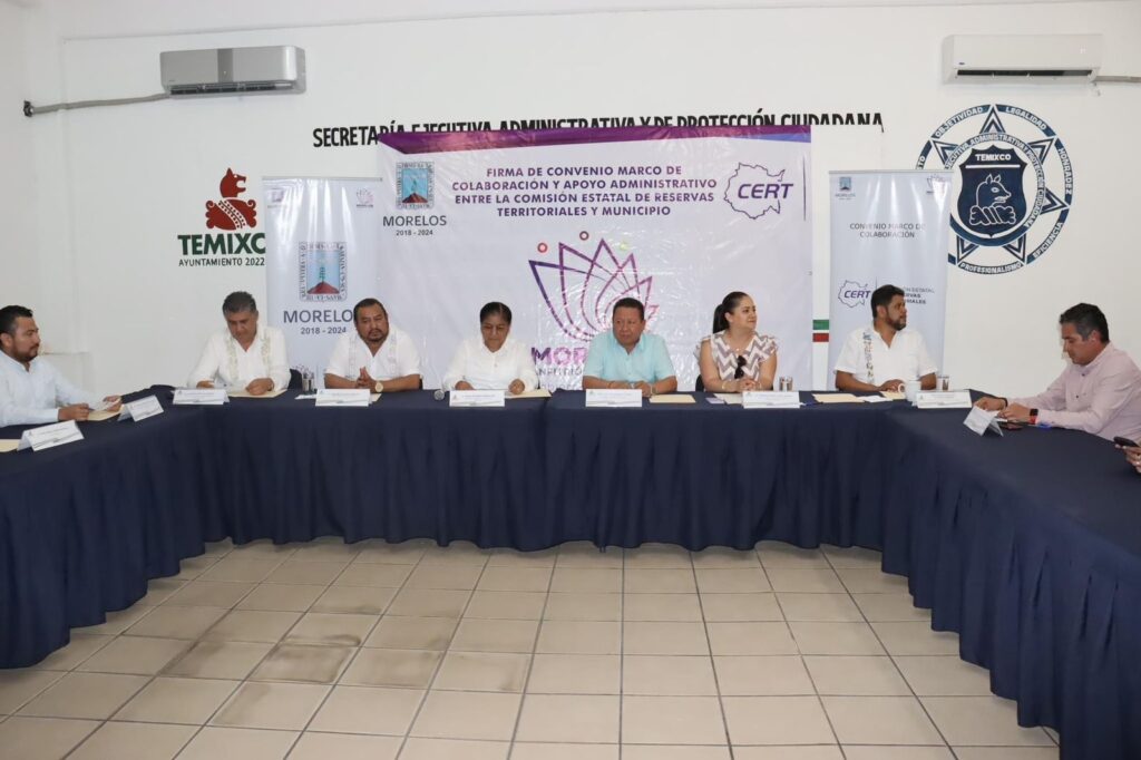 Con el objetivo de crear el acceso a las oportunidades de regularización de los bienes inmuebles y brindar certeza jurídica sobre el patrimonio inmobiliario de las familias la presidenta municipal del Ayuntamiento de Temixco Juanita Ocampo Domínguez en compañía del síndico municipal Andrés Duque Tinoco, el secretario general Carlos Caltenco Serrano y el secretario Particular de Presidencia Lic. Luis Alfonso Brito Escandón encabezaron la firma de convenio de colaboración y apoyo administrativo con la Comisión Estatal de Reservas Territoriales con la presencia del secretario de Desarrollo Sustentable del Gobierno de Morelos Ing. José Luis Galindo Cortés y la directora de la Comisión Estatal de Reservas Territoriales (CERT) Lic. Mónica Isabel Loyde García.
