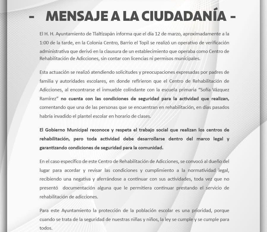 El H. H. Ayuntamiento de Tlaltizapán informa que el día 12 de marzo, aproximadamente a la 1:00 de la tarde, en la Colonia Centro, Barrio el Topil se realizó un operativo de verificación administrativa que derivó en la clausura de un establecimiento que operaba como Centro de Rehabilitación de Adicciones, sin contar con licencias ni permisos municipales.