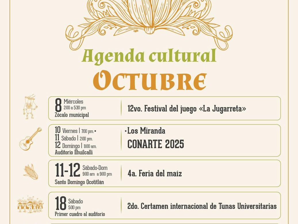 El H. Ayuntamiento de Tepoztlán da la bienvenida a Octubre como el mes dedicado a la celebración de nuestra rica herencia cultural. Con el objetivo de honrar el patrimonio del Pueblo Mágico y ofrecer una agenda diversa y de calidad, la Dirección de Cultura y Turismo ha preparado una serie de eventos para la comunidad y nuestros visitantes.