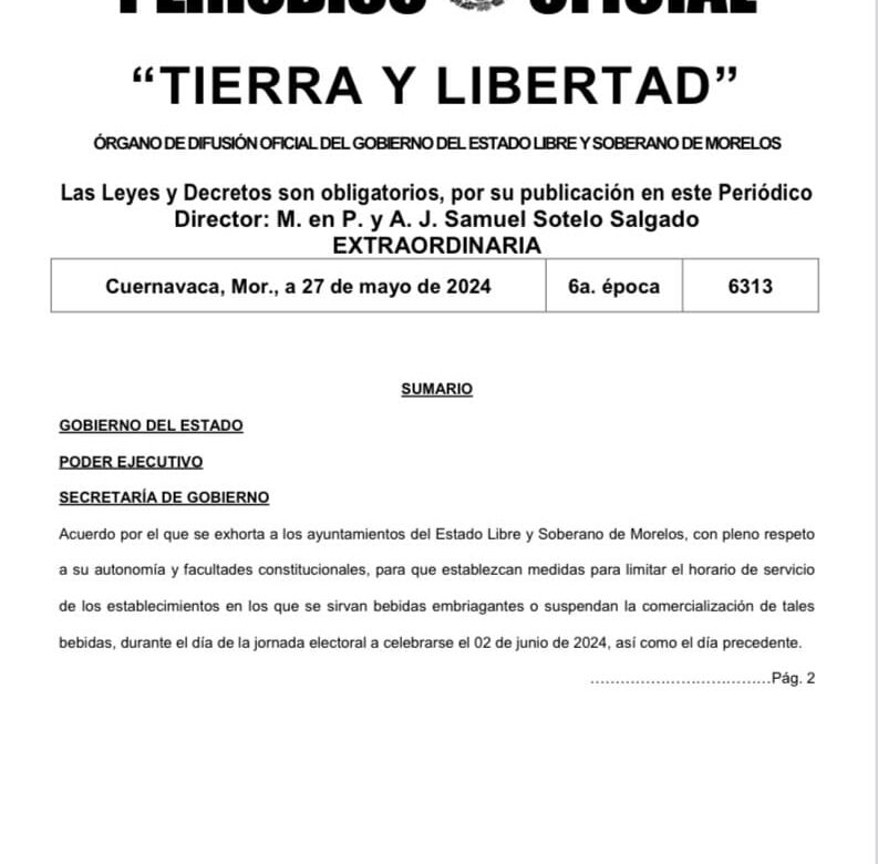 Con el propósito de coadyuvar a que en el territorio morelense se viva un clima de tranquilidad y paz social que permita desarrollar la próxima jornada electoral del 02 de junio de 2024 de manera pacífica y transparente, preservándose el orden y seguridad, el Ejecutivo estatal, a través de la Secretaría de Gobierno, publicó en el Periódico Oficial “Tierra y Libertad” el acuerdo en el que se determina la suspensión de la venta de bebidas alcohólicas.