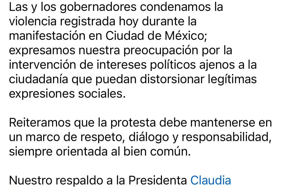 La gobernadora Margarita González Saravia se sumó al posicionamiento de las y los mandatarios del país, donde condenan los actos de violencia registrados hoy en la Ciudad de México y reiteran que toda manifestación debe desarrollarse en un ambiente de respeto, orden y paz pública.