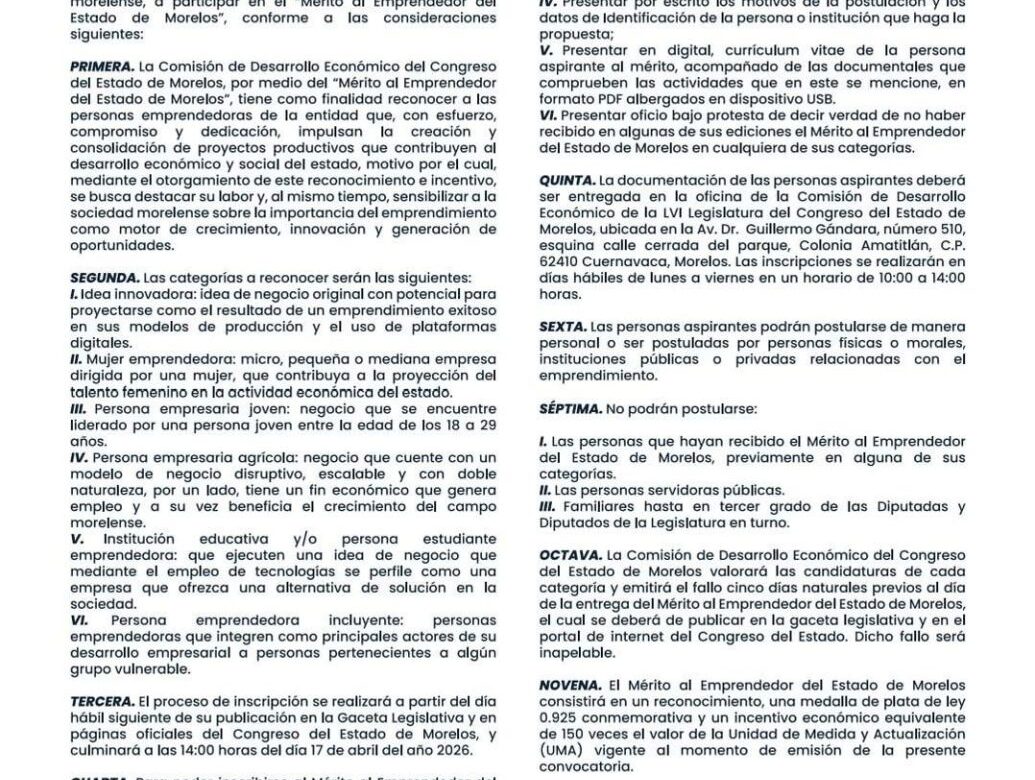 Te invitamos a participar y a consultar la convocatoria completa en el siguiente enlace: https://gerardogap.com.mx/2026/03/23/merito-al-emprendedor-del-estado-de-morelos-2026/