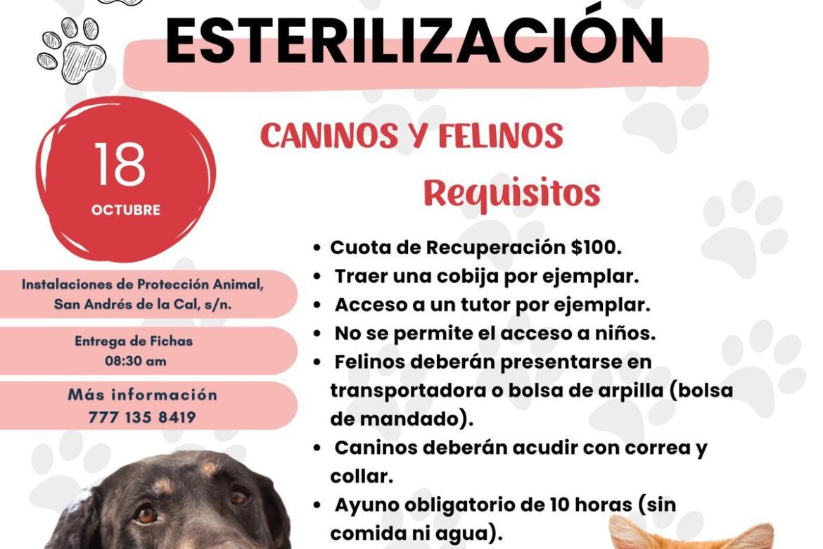 A partir del 18 de octubre de 2025, la Secretaría de Desarrollo Sustentable y Servicios Públicos (SDSySP) de Cuernavaca, a través del Departamento de Protección Animal, en colaboración con la asociación civil “Seres Sintientes Morelos”, pondrá en marcha una nueva etapa en favor del bienestar animal, ofreciendo mini campañas de esterilización canina y felina a bajo costo, aproximadamente cada mes, además de vacunación antirrábica gratuita.