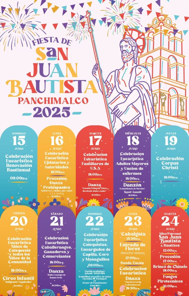 La fiesta patronal de San Juan Bautista dará inicio el domingo 15 de junio a las 9:00 de la mañana con una solemne eucaristía, en la que se invita a los asistentes a vestir de blanco. El novenario continuará hasta el 24 de junio, día principal de la festividad.