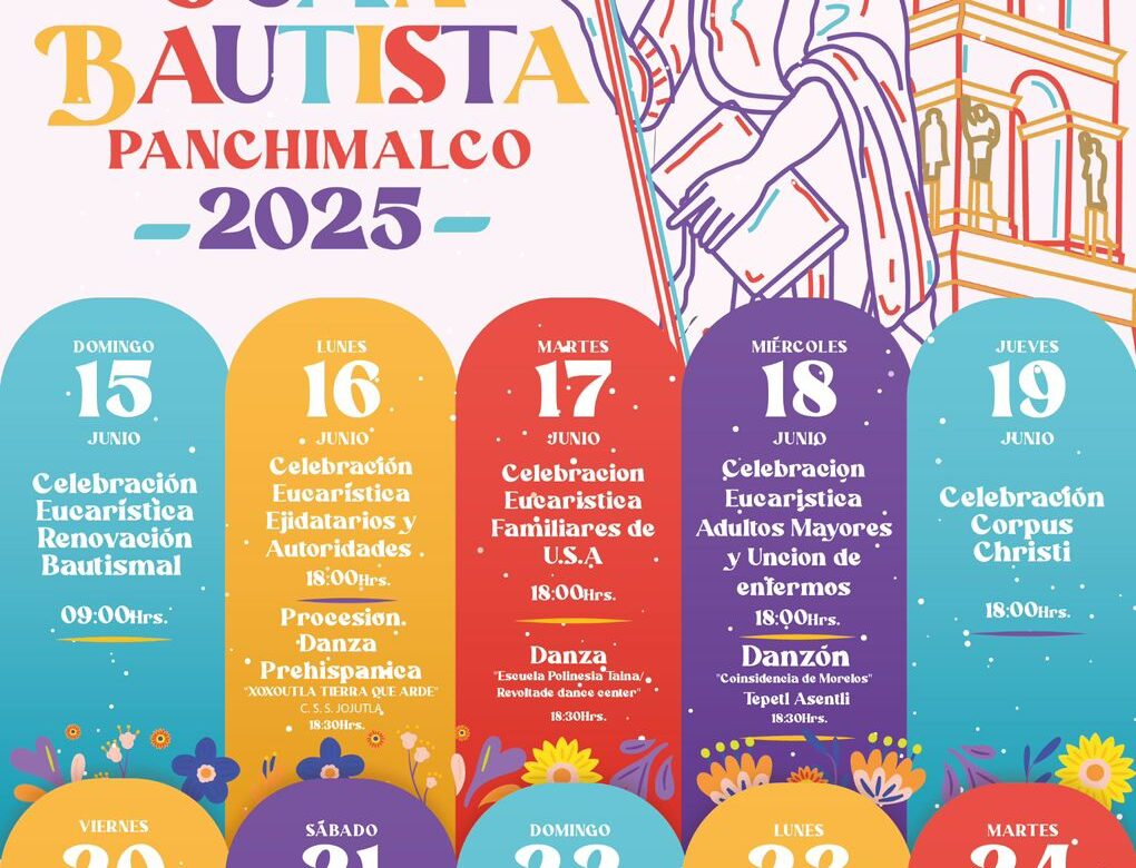 La fiesta patronal de San Juan Bautista dará inicio el domingo 15 de junio a las 9:00 de la mañana con una solemne eucaristía, en la que se invita a los asistentes a vestir de blanco. El novenario continuará hasta el 24 de junio, día principal de la festividad.