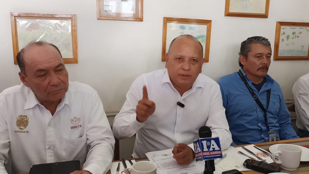 En rueda de prensa, los dirigentes del sindicato de maestros, Joel Sánchez Vélez; Ausencio González Basa, secretario del trabajo y conflictos del Sindicato Nacional del ISSSTE y Luis Manuel Rodríguez Olvera, dirigente local de la FEDESSP, denunciaron una serie de rezagos en la atención a los trabajadores federalizados.