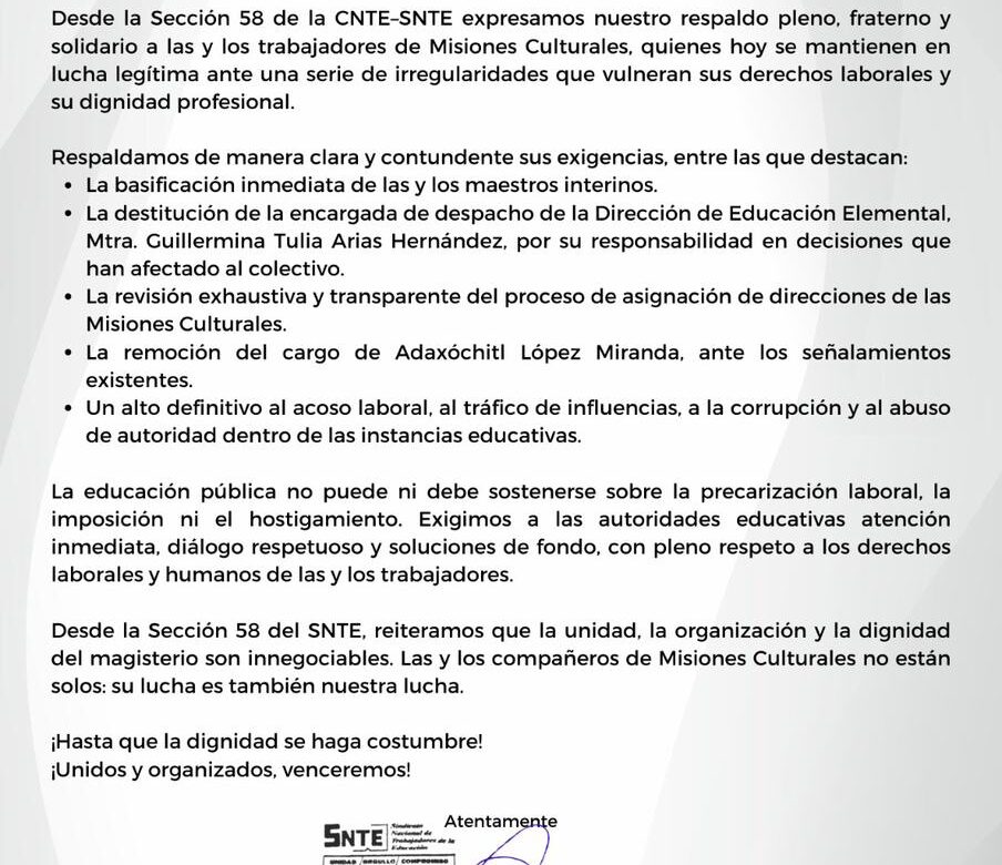 Ante tal situación, la Sección 58 del SNTE en Zacatecas y la Coordinadora Nacional de Trabajadores de la Educación (CNTE) en Morelos, manifestaron públicamente su respaldo de la base: “La educación pública no puede ni debe sostenerse sobre la precarización laboral, la imposición ni el hostigamiento. Exigimos a las autoridades educativas atención inmediata, diálogo respetuoso y soluciones de fondo, con pleno respeto a los derechos laborales y humanos de las y los trabajadores”, demandaron.