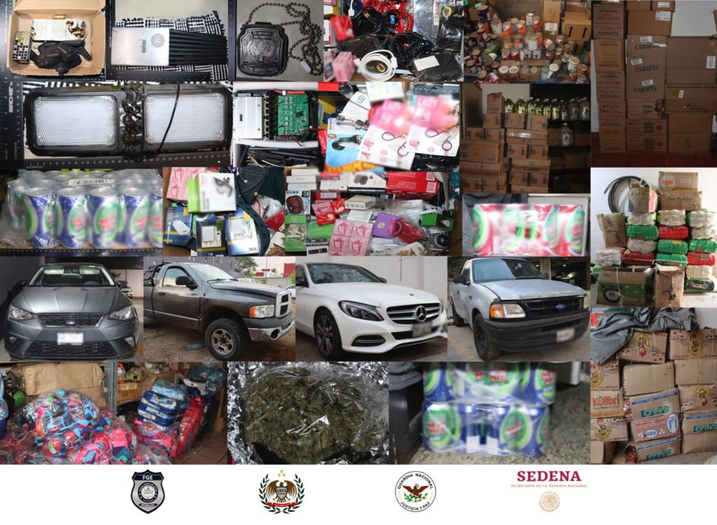 Resultado de las intervenciones realizadas, se aseguraron cinco teléfonos celulares, accesorios de luces policiacas (códigos), una placa metálica de un vehículo, dos inhibidores de señal, dos cajas con cartuchos balísticos calibre .45 y calibre .22, mercancía de procedencia ilícita consistente en bebidas alcohólicas, comestibles no perecederos insumos médicos y sanitarios, insumos de cocina, ropa y cobijas, residuos de narcótico, balas deformadas, objetos de plástico con apariencia de armas de fuego y un arma de fuego tipo larga, así como dos libretas con anotaciones sobre la forma de operar de la célula investigada.