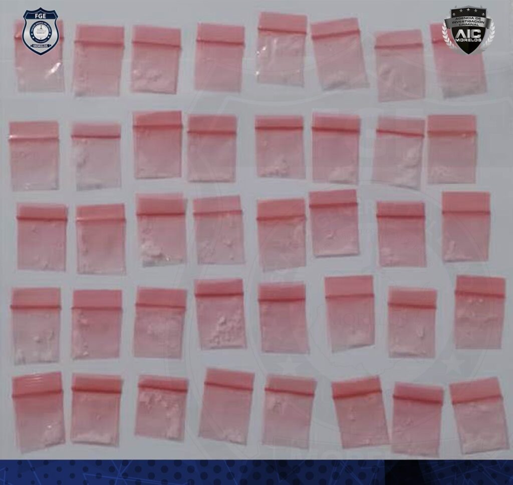 Una vez controlada la situación, se realizó una inspección a al hombre para descartar que pudiera portar algún objeto ilícito que pusiera en peligro su integridad y la de los elementos, localizándole 40 bolsitas de plástico de color rosa translucidas que en su interior contienen sustancia sólida granulada con las características similares de la droga conocida como cristal.
