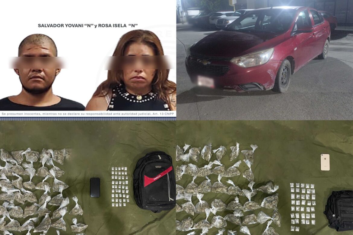 Al ser revisados, a Salvador Yovani “N”, Rosa Isela “N” y al adolescente les hallaron varias presuntas dosis de vegetal verde similar a marihuana y de material sólido cristalino característico al “cristal”, por lo que fueron puestos a disposición del MP por delito contra la salud.