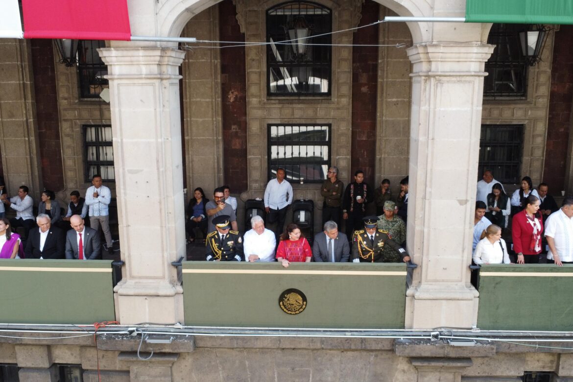 En el balcón ubicado en Palacio de Gobierno, con vista hacia la calle Galeana, la titular del Poder Ejecutivo compartió lugar con el magistrado presidente del Tribunal Superior de Justicia, Juan Emilio Elizalde Figueroa; el coronel de Infantería de Estado Mayor, Saúl Jaramillo García, jefe de Estado Mayor de la 24/a Zona Militar; y el general brigadier de Estado Mayor, Raúl Meneses Castrejón, titular de la Coordinación Estatal de la Guardia Nacional.