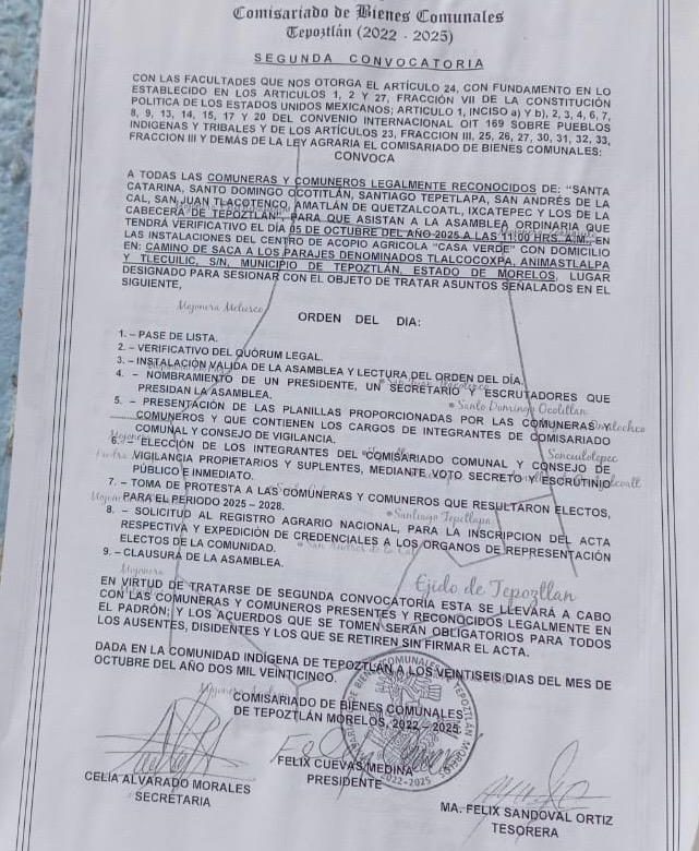 Fecha de Asamblea Tentativa: La Segunda Convocatoria, notificada el 29 de septiembre de 2025 por Félix Cuevas Medina, Presidente del Comisariado , convoca a los comuneros a una asamblea el