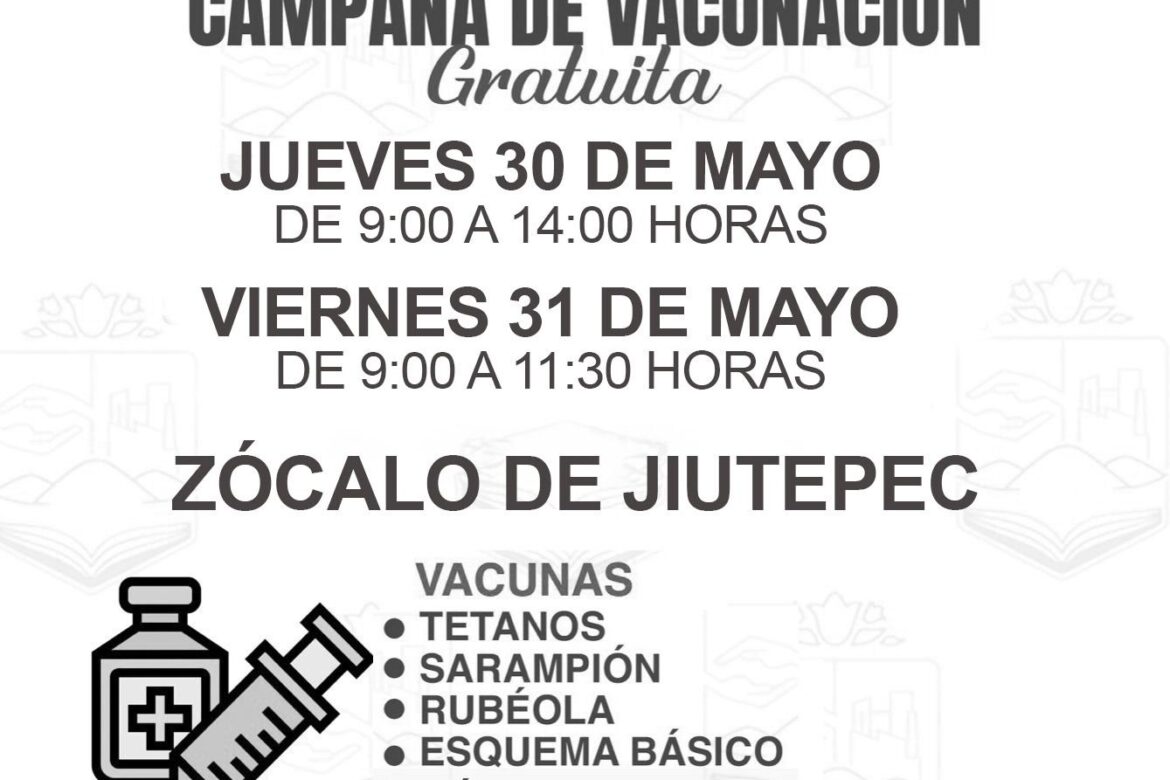 El Gobierno de Jiutepec invita a la población del municipio a participar en las jornadas de la campaña de vacunación a realizarse el jueves 30 de mayo de las 9:00 a las 14:00 horas y el viernes 31 de mayo de las 9:00 a las 11:30 horas en el módulo que estará ubicado en el zócalo de la cabecera municipal.
