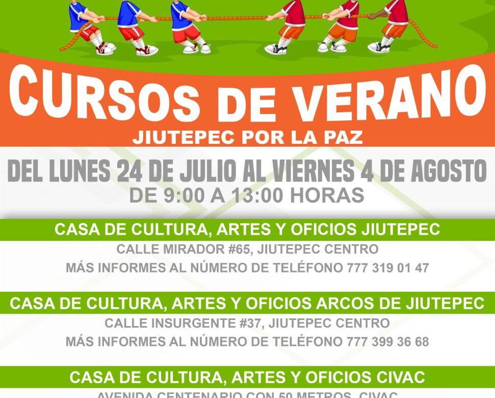 El Gobierno con Rostro Humano, encabezado por el alcalde Rafael Reyes, invita a niñas y a niños del municipio a participar en el curso de verano “Jiutepec por la paz” el cual se impartirá del lunes 24 de julio al viernes 4 de agosto en las Casas de Cultura, Artes y Oficios de las colonias Centro y Civac, así como en la de la unidad habitacional Arcos de Jiutepec.
