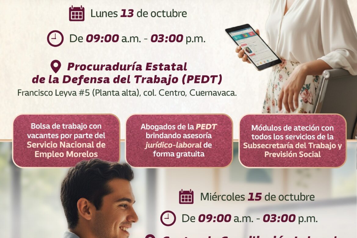 Las jornadas se realizarán de forma permanente los lunes y miércoles, de 9:00 a 15:00 horas, inician el 13 de octubre en las instalaciones de la PEDT ubicadas en calle Francisco Leyva número 5, en el Centro de Cuernavaca. Asimismo, el Servicio Nacional de Empleo (SNE) Morelos participará con vacantes incluyentes y pleno respeto a la legalidad laboral.