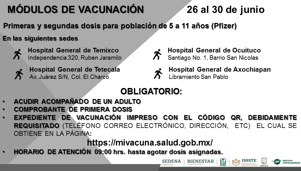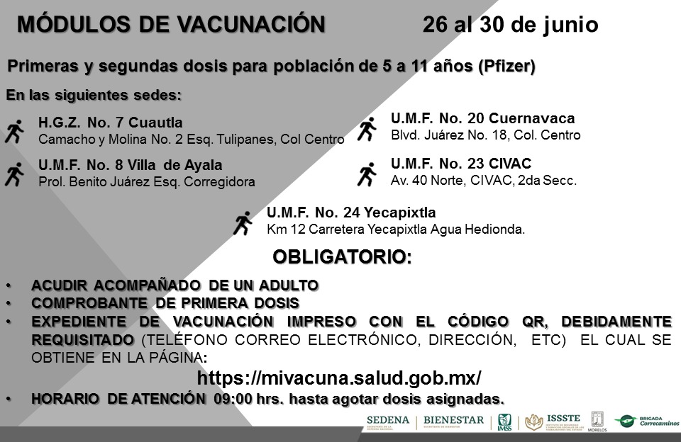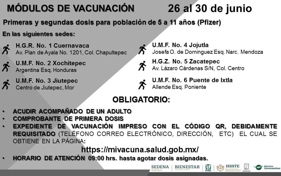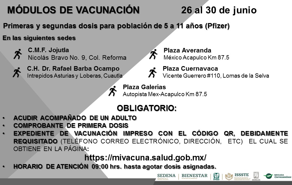 La Brigada Correcaminos en Morelos invita a padres de familia o tutores a llevar a sus hijas e hijos de 5 a 11 años de edad para que reciban la primera o segunda dosis contra COVID-19 en alguna de las 20 sedes que fueron habilitadas del lunes 26 al viernes 30 de junio.