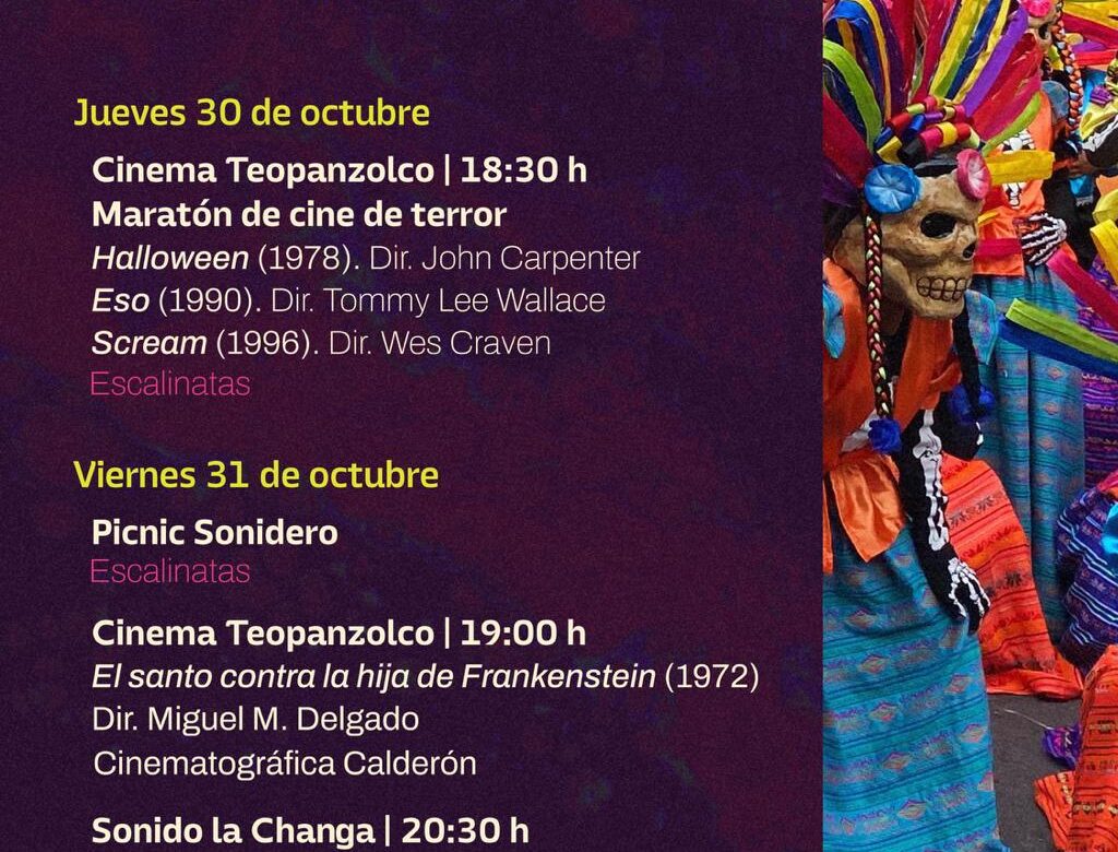 En este sentido, detalló que el 30 de octubre, Cinema Teopanzolco proyectará un maratón de cine de terror con tres clásicos bajo las estrellas: Halloween (1978), Eso (1990) y Scream (1996); la cita es a las 18:30 horas, en las escalinatas.