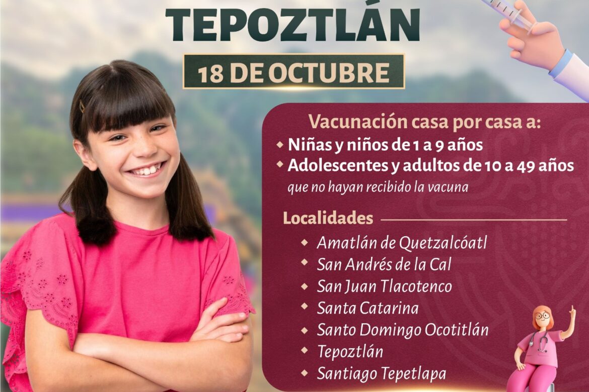 La Secretaría de Salud, a través de Servicios de Salud de Morelos (SSM), IMSS bienestar, IMSS Ordinario, ISSSTE y Servicio Nacional de Salud Pública, convoca a la población de Tepoztlán a participar en la jornada de vacunación casa por casa contra el sarampión y otras vacunas del esquema básico de salud, a realizarse el próximo 18 de octubre, con el objetivo de fortalecer la protección de niñas, niños y personas adultas frente a enfermedades prevenibles.