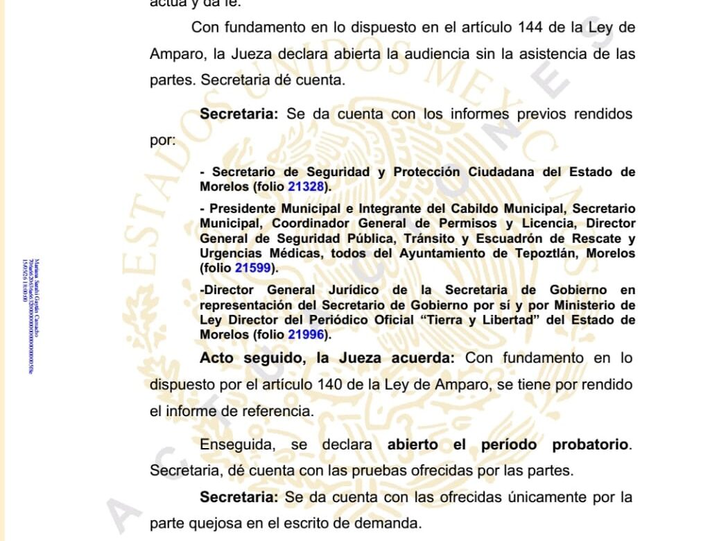 La Jueza Perla Fabiola Estrada Ayala, titular del Juzgado Quinto de Distrito en el Estado de Morelos, negó la suspensión definitiva solicitada por un grupo de comerciantes semifijos y ambulantes, para permsnecer en la Plaza Cívica de Tepoztlán.