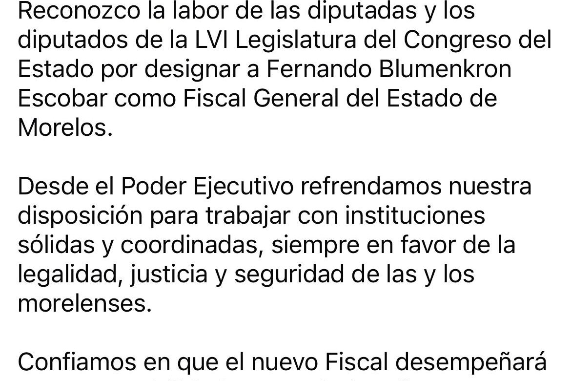La gobernadora Margarita González Saravia reconoció el trabajo del Congreso del Estado tras la designación de Fernando Blumenkron Escobar como Fiscal General de Morelos.