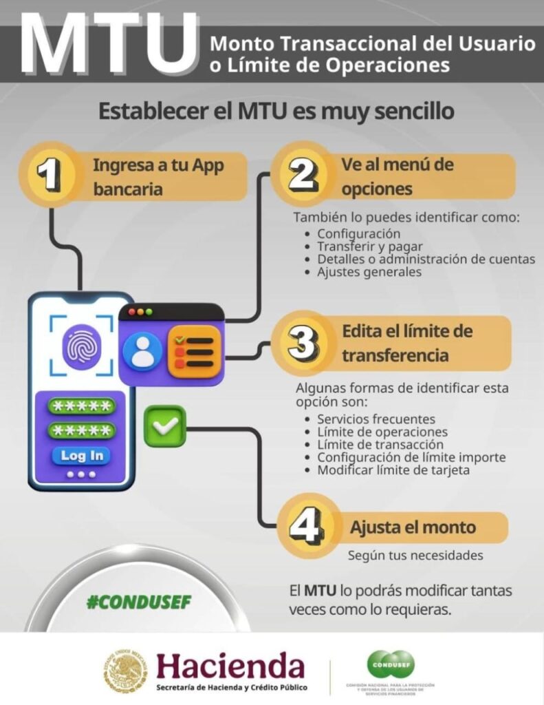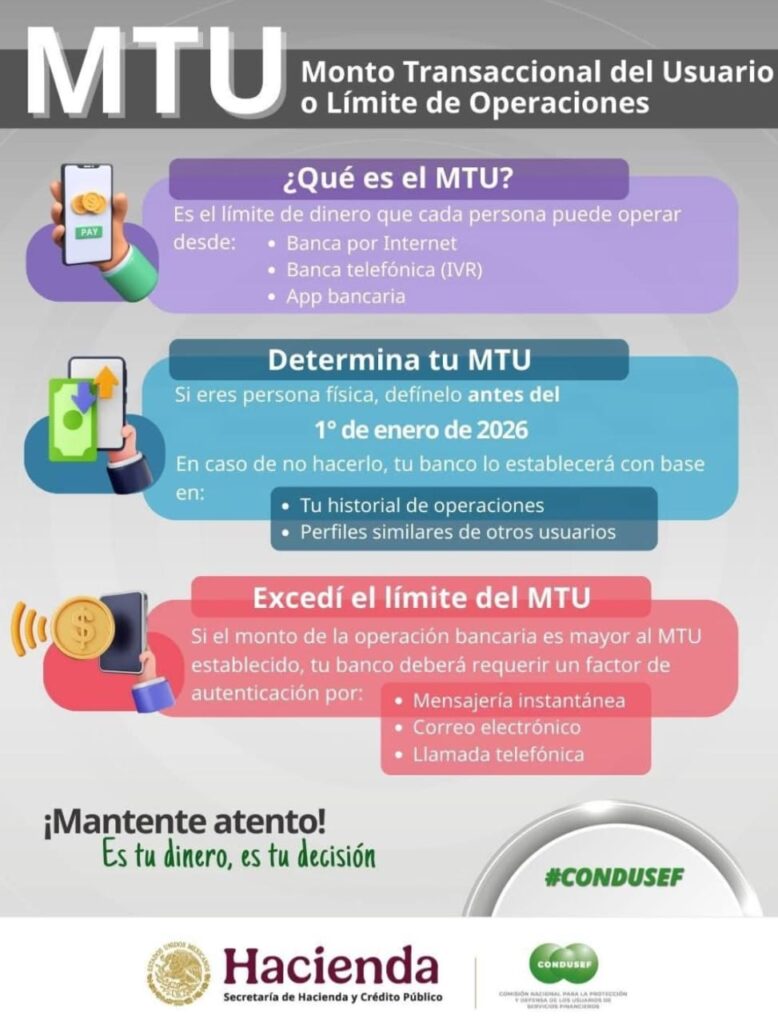 CONDUSEF Morelos informa que a partir de este primero de octubre de 2025, todas las instituciones bancarias del país deben de contar con la infraestructura para que los cuentahabientes puedan decidir el Monto Transaccional del Usuario MTU, lo que significa definir el límite de tus operaciones ya sea en Banca por internet, Banca telefónica IVR o a través de la aplicación de tu banco y se establece la fecha del 1 de enero de 2026 para que los usuarios cuentahabientes que utilizan las transferencias electrónicas, establezcan el monto de sus operaciones, en dado caso que no se definan un monto la disposición de carácter general aplicable a las instituciones de crédito publicada desde el 14 de junio de 2025 establece la referencia de 1,500 UDIs, indicador que se encuentra en $8.552, lo que aproximadamente asciende a $12,800.00 pesos, los beneficios de esta medidas se centran en: