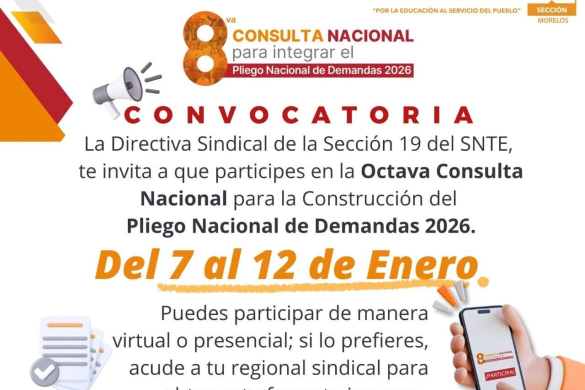 La dirigencia de la Sección 19 del Sindicato Nacional de Trabajadores de la Educación (SNTE) convocó a la base a participar en la octava consulta en el país, para integrar el Pliego Nacional de Demandas 2026.