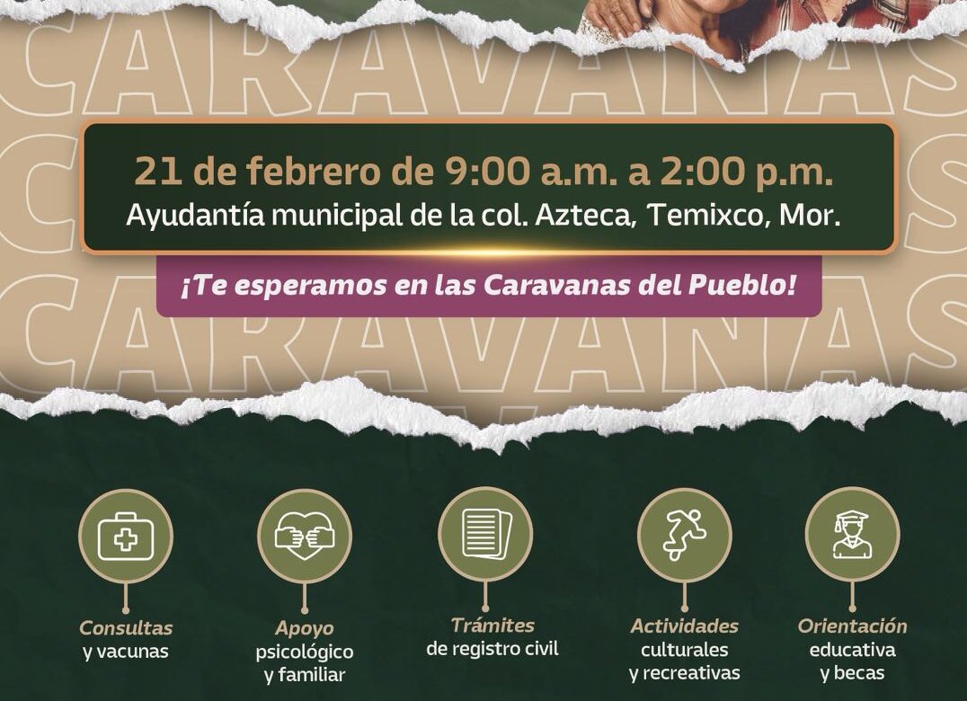 Con la prioridad de transformar la vida de las personas y garantizar sus derechos, el Gobierno del Estado que encabeza Margarita González Saravia, realizará este sábado 21 de febrero la tercera edición de las Caravanas del Pueblo 2026 en la ayudantía municipal de la colonia Azteca, en el municipio de Temixco.
