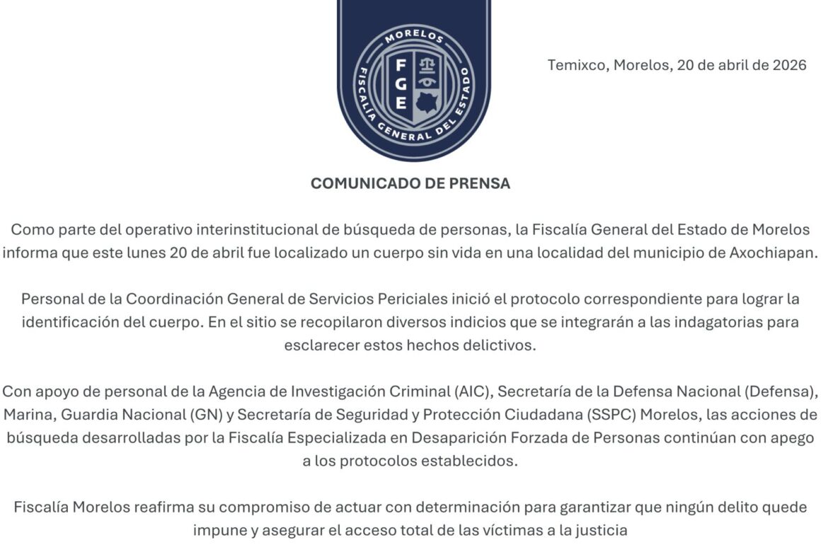 Como parte del operativo interinstitucional de búsqueda de personas, la Fiscalía General del Estado de Morelos informa que este lunes 20 de abril fue localizado un cuerpo sin vida en una localidad del municipio de Axochiapan.