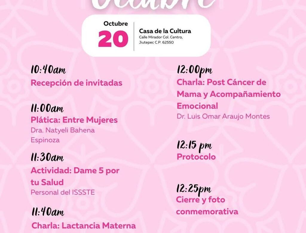 El Ayuntamiento de Jiutepec y el DIF Municipal invitan a todas las mujeres a participar en esta jornada del mes rosa. 💕