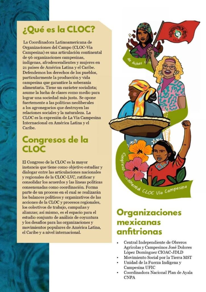 La Coordinadora Latinoamericana de Organizaciones del Campo (CLOC-Via Campesina) es una articulación continental de 96 organizaciones campesinas, indígenas, afrodescendientes y mujeres en 21 países de América Latina y el Caribe: “Defendemos los derechos de los pueblos, particularmente la producción y vida campesina que garantice la soberanía alimentaria. Tiene un carácter socialista; asume la lucha de clases como medio para lograr una sociedad más justa. Se opone fuertemente a las políticas neoliberales a los agronegocios que destruyen las relaciones sociales y la naturaleza. La CLOC es la expresión de La Vía Campesina Internacional en América Latina y el Caribe”, expusieron los organizadores.