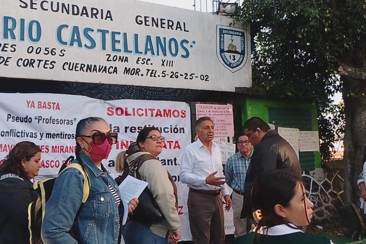 Hasta el lugar se dio cita Gerardo Contreras Franco, director de Secundarias Generales del Instituto de la Educación Básica del Estado de Morelos (IEBEM) en busca de diálogo con los inconformes. Un abogado del área jurídica lo acompaña para levantar un acta de los hechos.