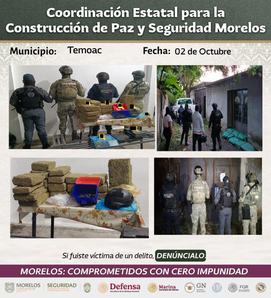 En la municipalidad de Temoac, en distintas fechas fueron cumplimentadas órdenes de cateo contra el Grupo Delictivo “La Patrona” y/o “Los Aparicio”, en las que fueron asegurados 80 kilos de vegetal verde similar a la “marihuana”, cartuchos útiles de diferentes calibres de arma larga, básculas grameras y portátiles, varios chips para teléfono celular y una credencial INE a nombre de Andrea Angelina “N”.