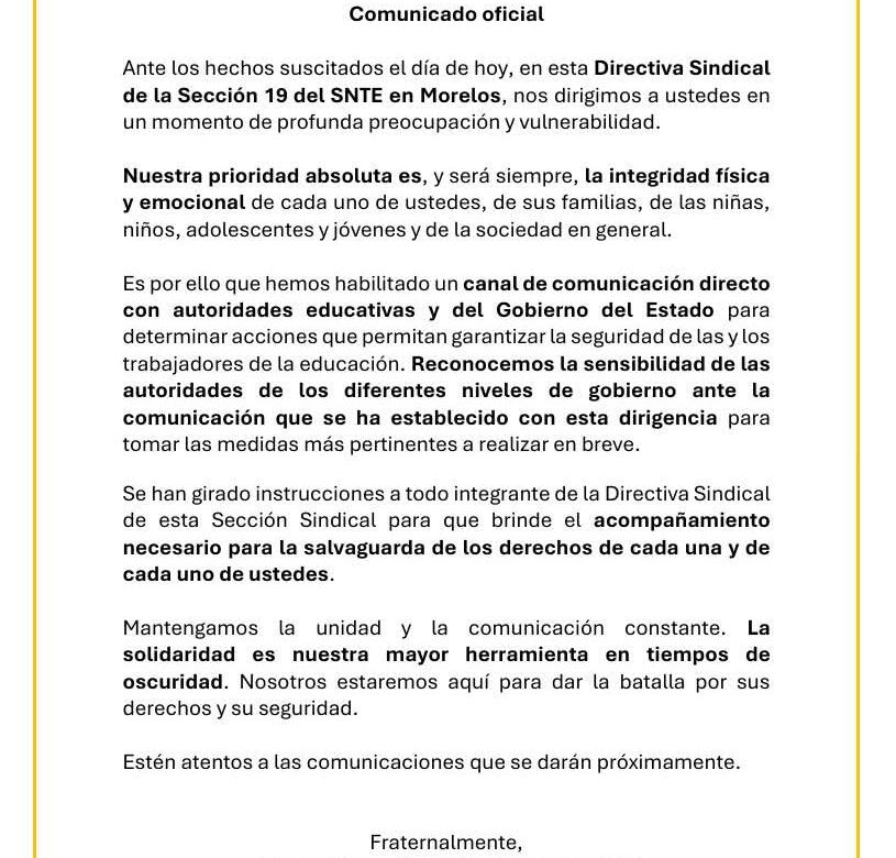 Ante los hechos suscitados este domingo, la Directiva Sindical de la Sección 19 del SNTE en Morelos, reiteró que su “prioridad absoluta es, y será siempre, la integridad física y emocional” de cada uno de sus agremiados y de sus familias, de las niñas, niños, adolescentes y jóvenes y de la sociedad en general.