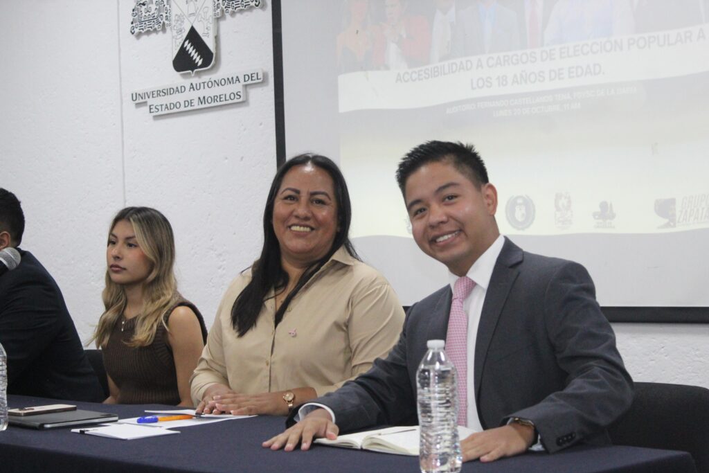 En el marco del conversatorio “Diputados a los 18 años”, realizado en el Auditorio Fernando Castellanos Tena de la Facultad de Derecho y Ciencias Sociales de la UAEM, la diputada local Jazmín Solano López habló de su iniciativa de reforma constitucional para permitir que jóvenes a partir de los 18 años puedan ocupar cargos de elección popular en el estado de Morelos, como diputaciones locales, cabildos y ayudantías municipales.
