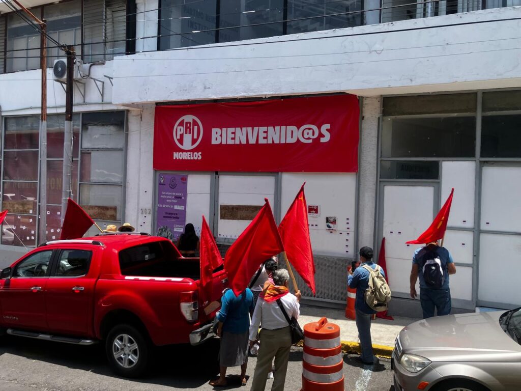 Militantes del Partido Comunista de México realizaron un acto de repudio afuera de las oficinas del PRI Morelos.